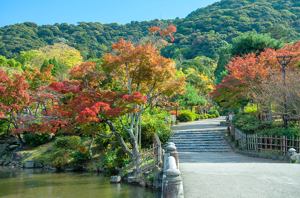 明治19年(1886)に開かれた京都で一番古い公園で、市民の憩いの場でもあります。園内の中央にある「祇園しだれ桜」を始め約1,000本の桜が咲く名所として知られていますが、カエデ、モミジなど色づく木々も多く、借景に東山を望み、ゆっくりと紅葉を楽しめる穴場です。