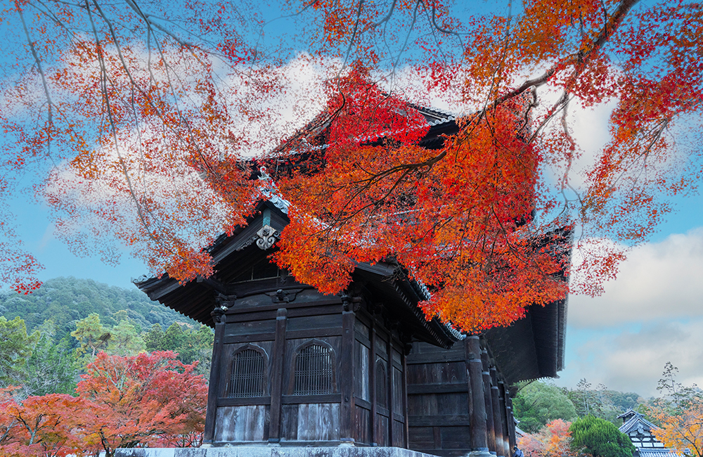 三千院、妙法院と並ぶ天台宗三門跡の一つで、入口には大きな楠が目をひきます。後桜町上皇が天明の大火時に仮御所としたことから、粟田御所の別名があります。宸殿、華頂殿、小御所、本堂と進んでいくと、どこも御所の名にふさわしい優雅な雰囲気が漂います。華頂殿から見る小堀遠州霧島の庭、小御所から見る相阿弥の庭の紅葉も境内の優雅さを高めているようです。本堂の国宝、青不動明王画像を拝観した後、庭園の紅葉を見ながらのんびり散策を楽しんでください。